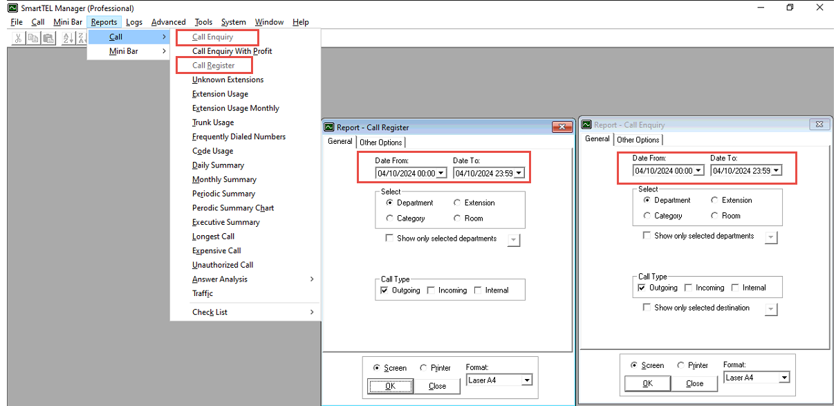 Select either "Call Enquiry" or "Call Register" based on your needs.