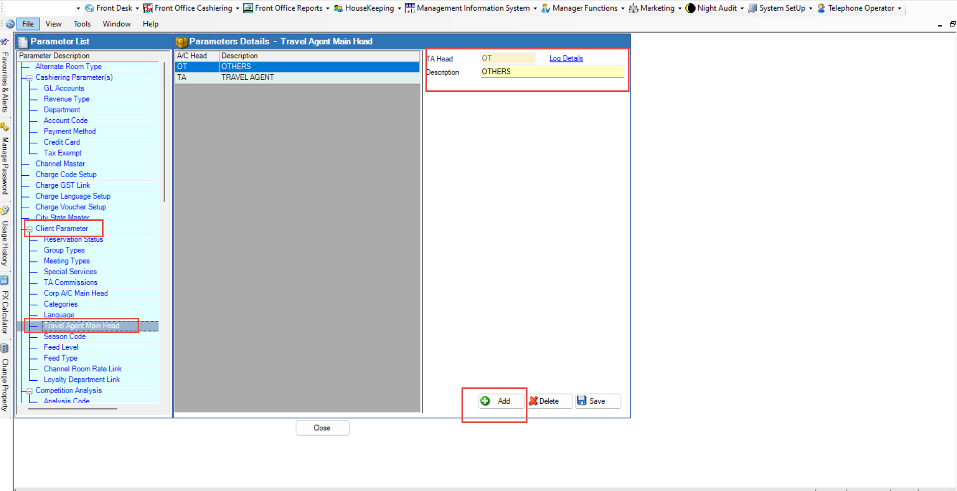 3.Expand Client Parameter where you will find Travel Agent main Head. This screen can be used to create OTA Main Head. Please refer the screenshot for your reference.