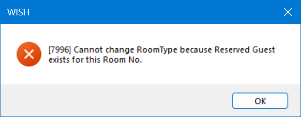 We cannot change the room type for certain rooms if any in-house guests are occupying them. If a room is occupied, an error will be generated as shown below. Please ensure that the room does not have any current in-house guests or any future reservations before attempting to change the room type.