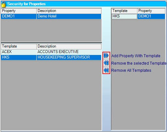 Step 9: Select the property and template, then assign them using the arrow buttons provided. Their functions are labeled in the accompanying image.