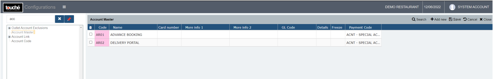 For every Special Account settlement key created, 1 or more account is to be defined in Account Master as well, so on settlement the option to select those Account will be shown. Creation is done by clicking Add New, entering the details alike below with Payment Code selected, and clicking Save.