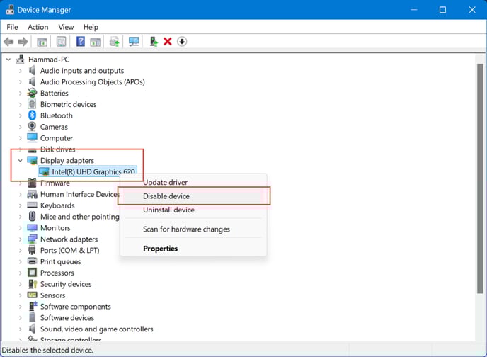 - Next, you will need to disable your display driver. To do this, go to Device Manager, locate "Display adapters," and disable the driver as shown below.
