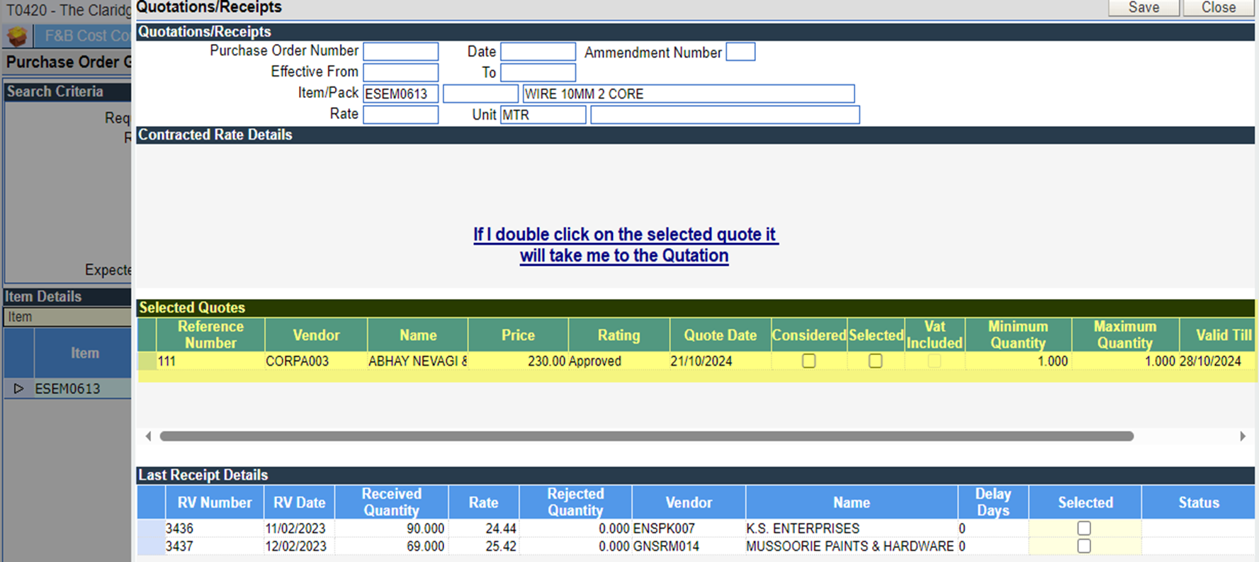 While clicking on the ‘open quote’ in PO and quotation details will pop up and while double clicking on the quotation the entry will open.