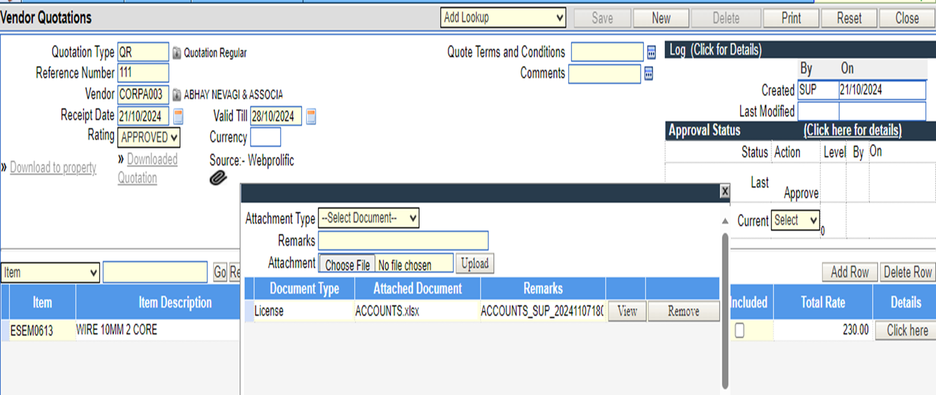 Once the quotation is open the attachment can be viewed from the same window.