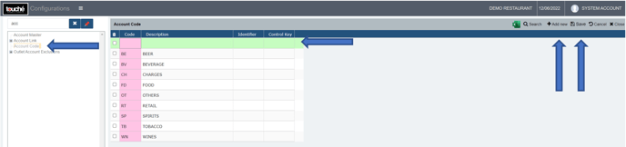 Account Codes serve as the main revenue head for items, managed under Account Code. These are also those under which Item revenue is linked under Items Master and Discounts are linked to in Discount Details.