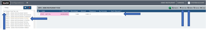 - To have them start calculating, the taxes should be linked to Charge codes by going to Charge Code Tax Link. Linking is done by clicking the + sign, selecting the Charge Code, clicking Add New, selecting the Tax/VAT, setting the start date, the Tax/VAT percentage and clicking Save.