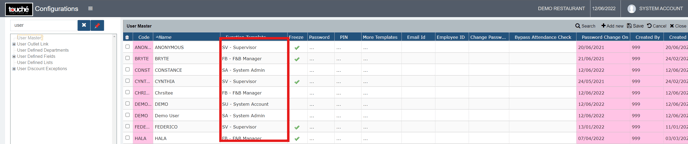 Touche follows a template based access level management, where different templates can be given different access permissions, and one template can be assigned to a user. This access level includes, functions in the POS, reporting, Night Audit, Interfacing and further on.