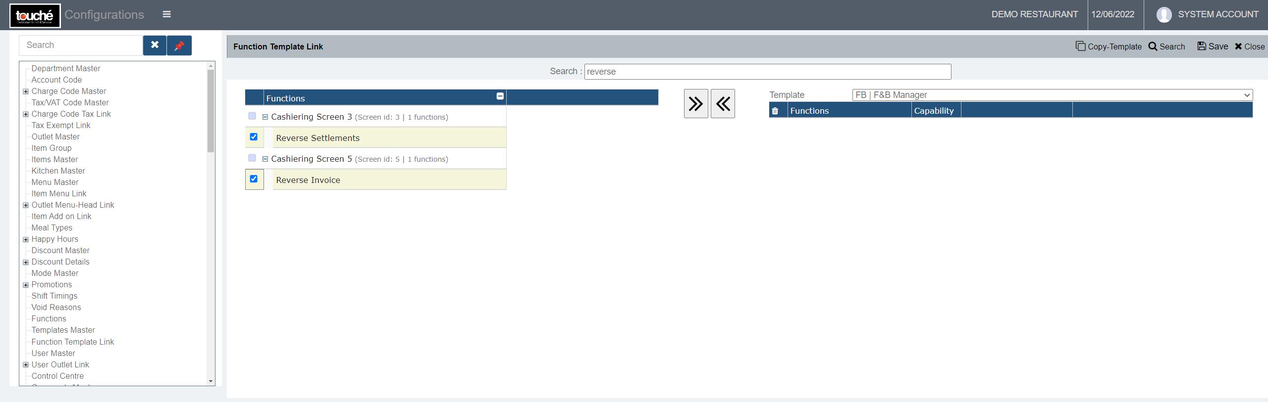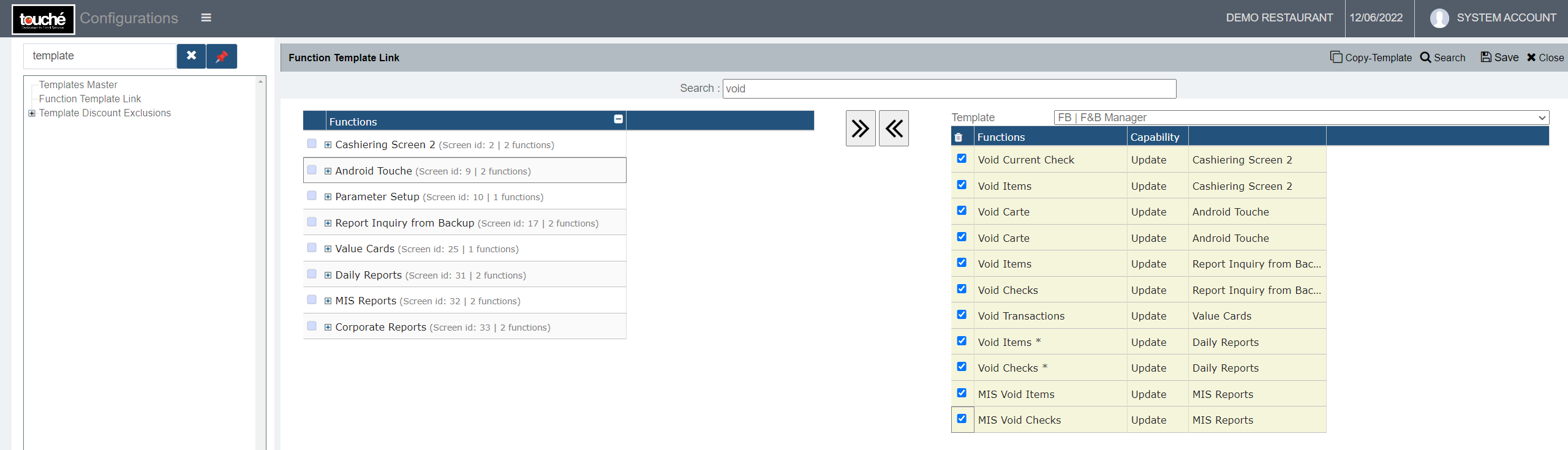 The Function Template Link screen shows all functions of the system in the left, and the template's available functions in the right. Below are the primary ones